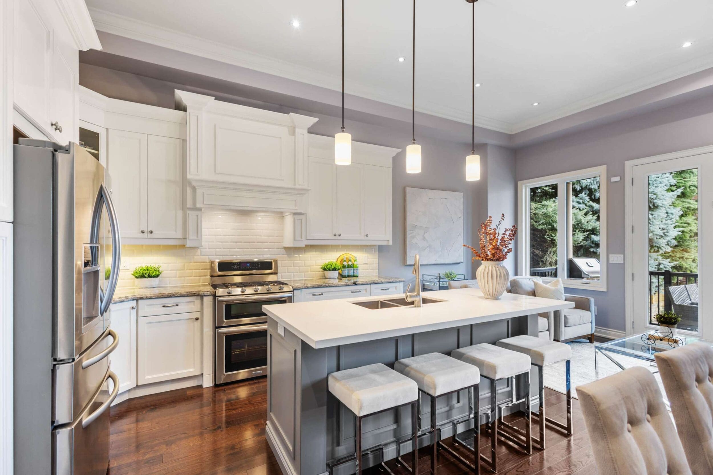 Inside, you’ll find an open-concept layout with soaring 11-foot ceilings and gorgeous hardwood floors throughout. The expansive design creates a bright, airy atmosphere perfect for entertaining or relaxing. The chef’s kitchen features brand-new quartz countertops, freshly painted cabinets, and ample space for culinary creations. Flowing seamlessly into the dining and family rooms, the space invites gathering and connection, with a walkout to a covered porch overlooking the backyard.