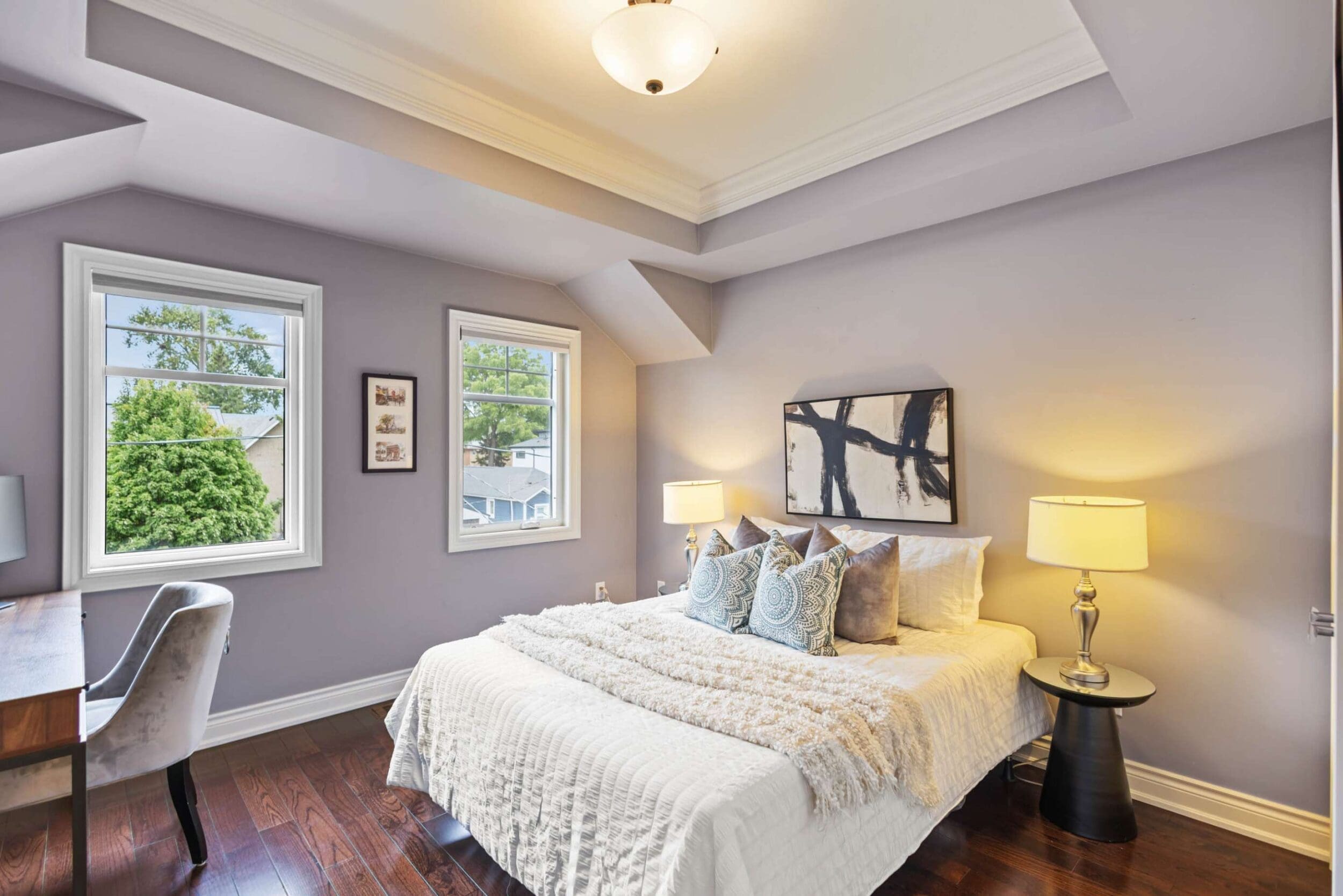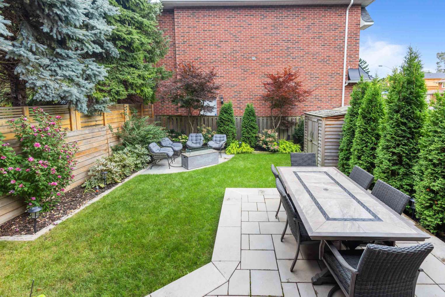 The backyard, professionally landscaped in 2021, is a private sanctuary lined with mature trees, ideal for hosting BBQs or unwinding by the fire pit. Whether enjoying a morning coffee on the porch or an evening gathering with friends, this outdoor space is a true retreat.